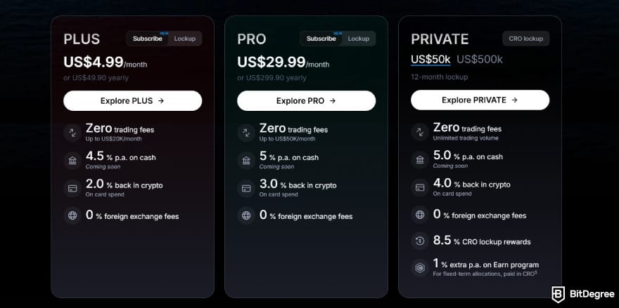 In case I wasn’t clear, you only need to choose either to pay the subscription fee or go with the CRO lock-up to activate the Plus and Pro tiers. Unfortunately, that flexibility isn’t available for the Private tiers, which require you to lock up a much larger amount of CRO for a full year.